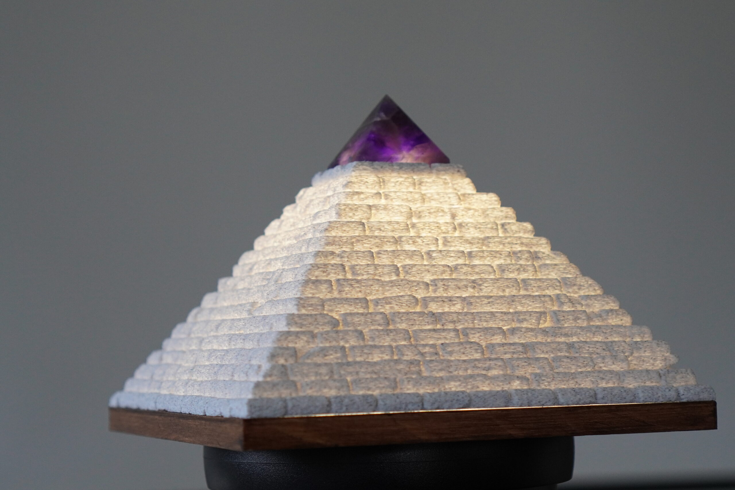 Amethyra is geen gewone lamp, maar een sculpturaal lichtobject in de vorm van een piramide, bekroond met een amethist piramidetop. Het ontwerp verbindt natuurlijke materialen met zacht, mystiek licht — een harmonie tussen stabiliteit en verfijnde energie.