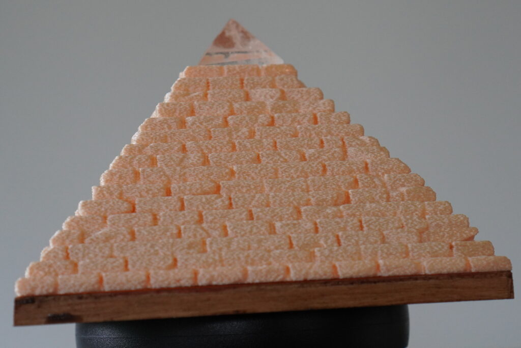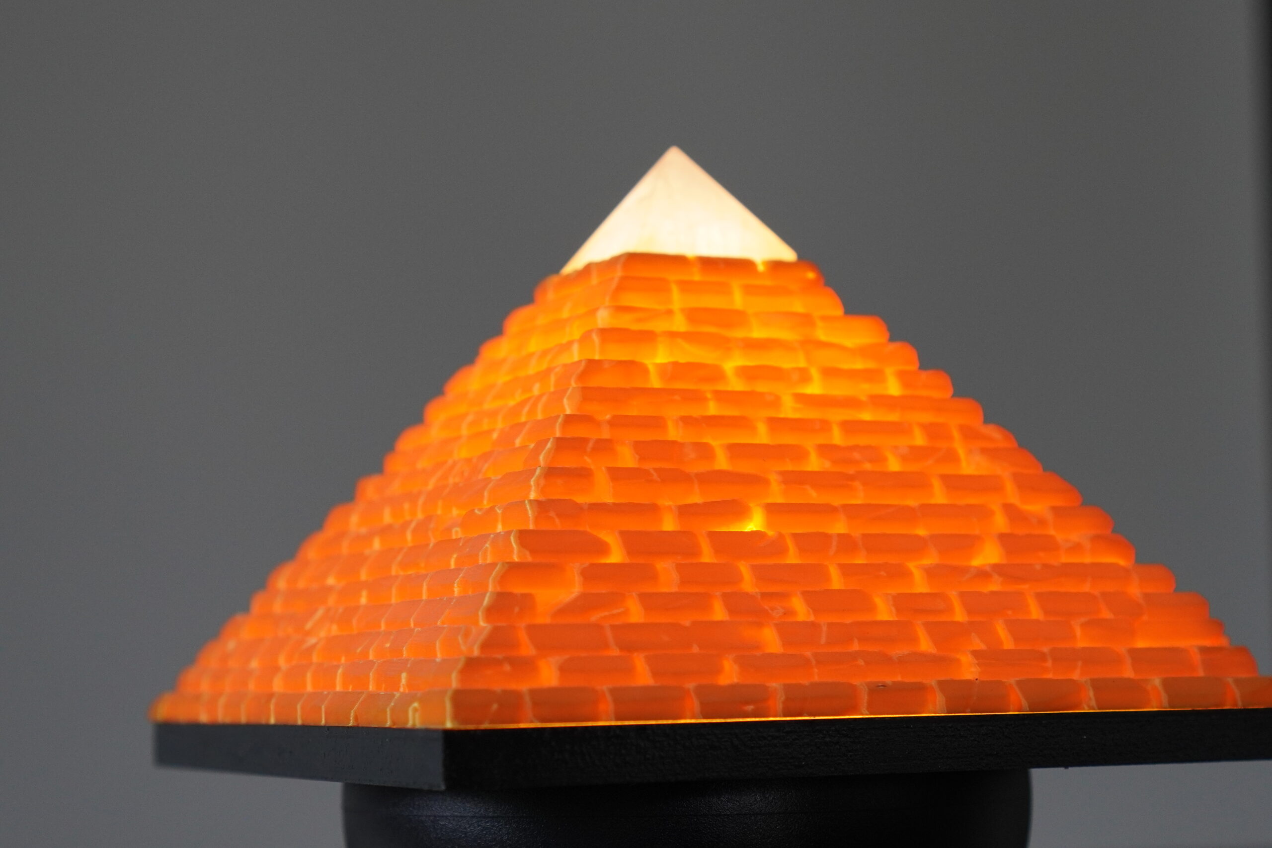 Afmetingen: 15*15*11 cm. Basis: Hout. Piramide: 3d print. Ledlamp met dimmer. Top Rozenkwarts