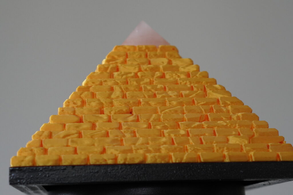 Afmetingen: 15*15*11 cm. Basis: Hout. Piramide: 3d print. Ledlamp met dimmer. Top Bergkristal