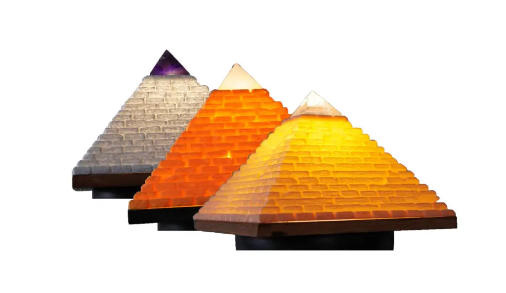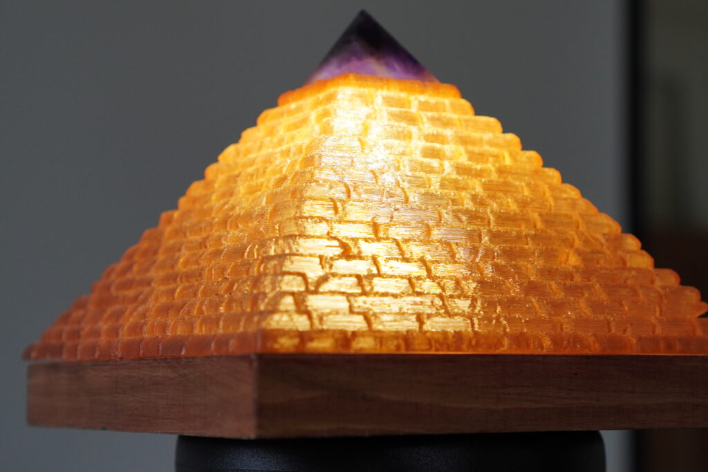 Afmetingen: 15*15*13 cm. Basis: Hout en Orgonite. Piramide: 3d print. Ledlamp met dimmer. Top Amethist