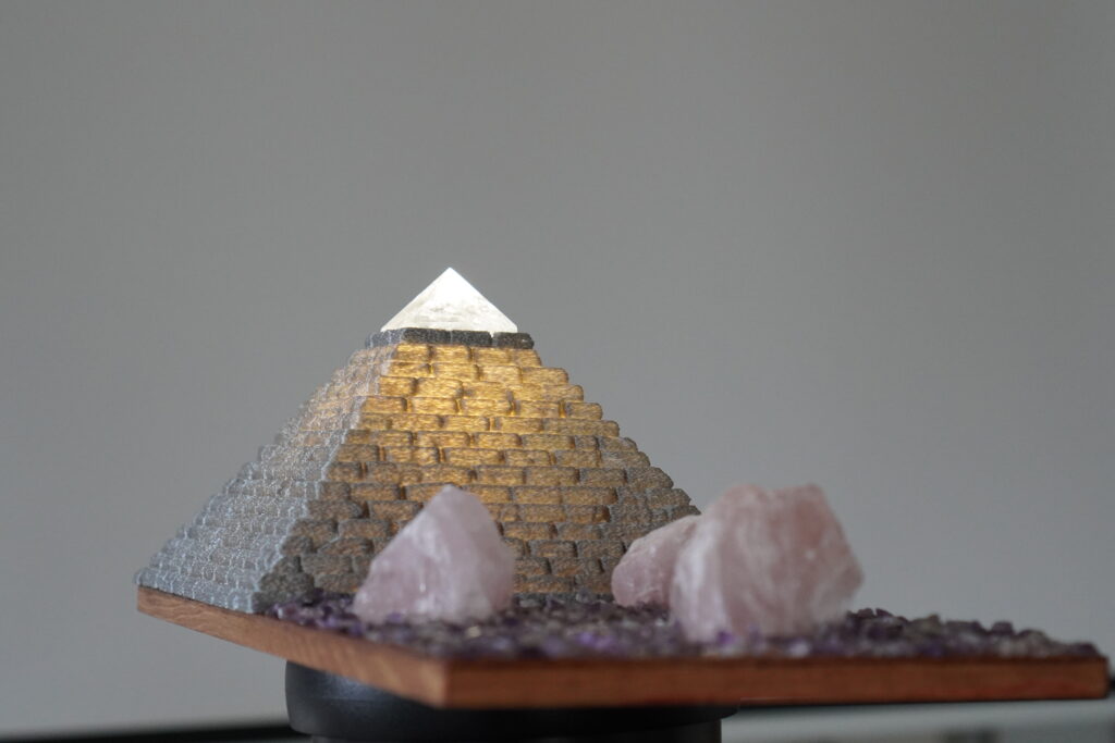 Afmetingen: 15*30*11 cm. Basis: Hout. Piramide: 3d print. Ledlamp met dimmer. Top Bergkristal. Grind van Amethist. Brokken rozenkwarts
